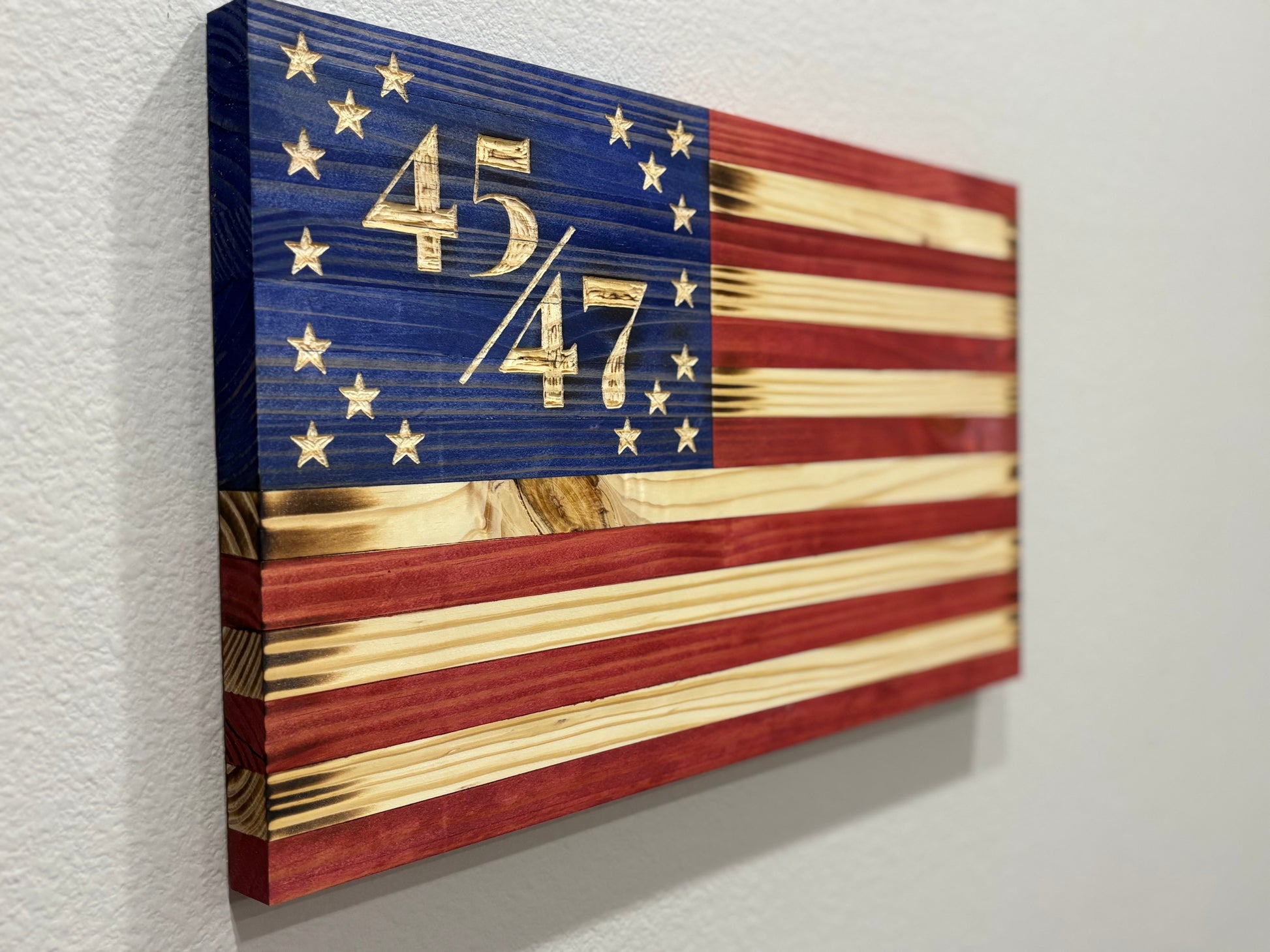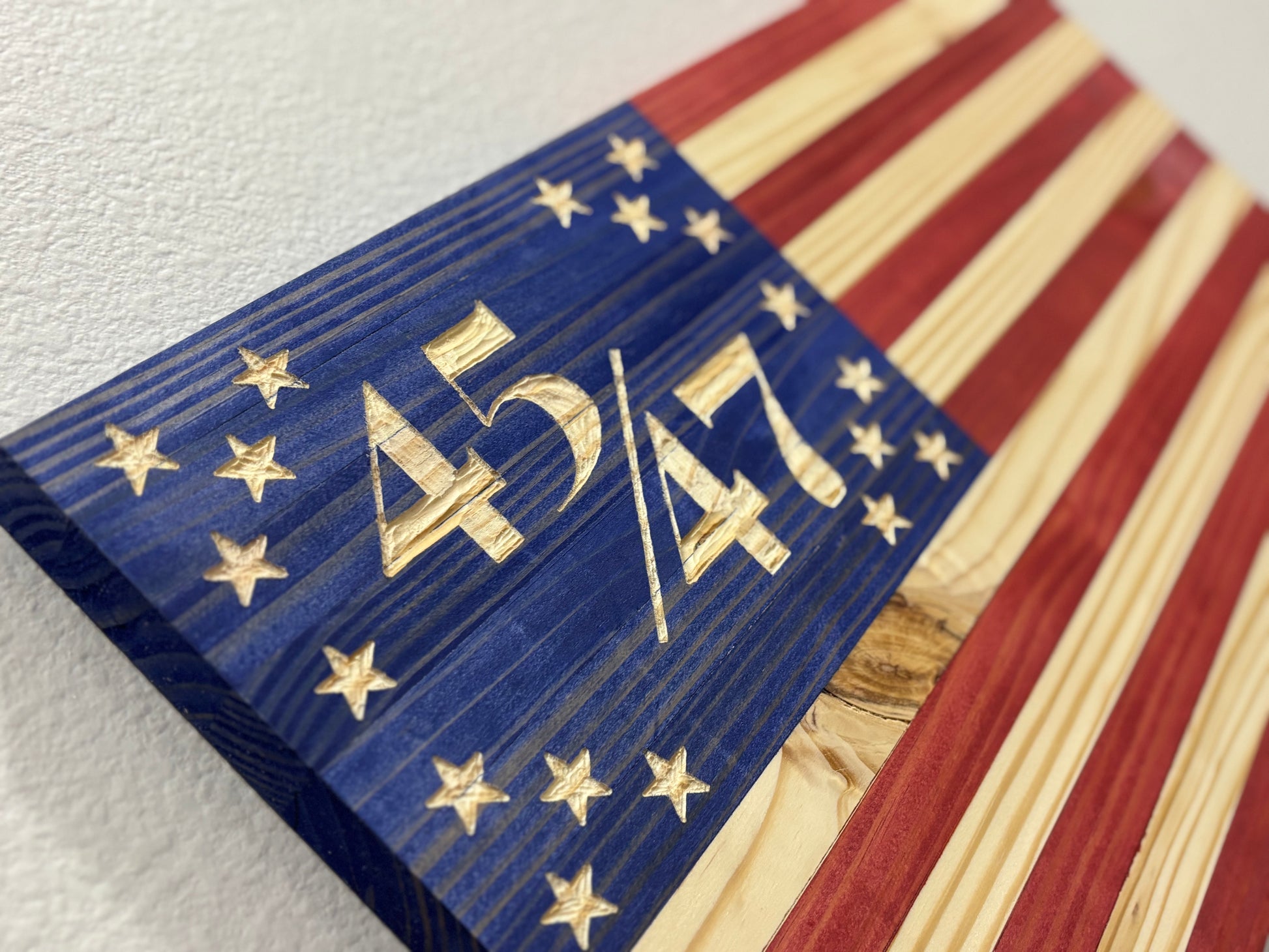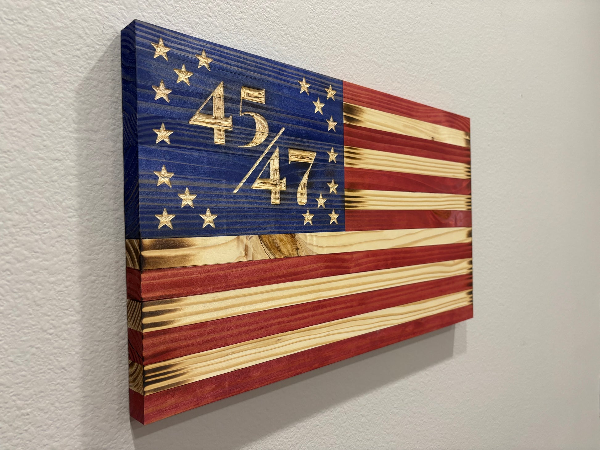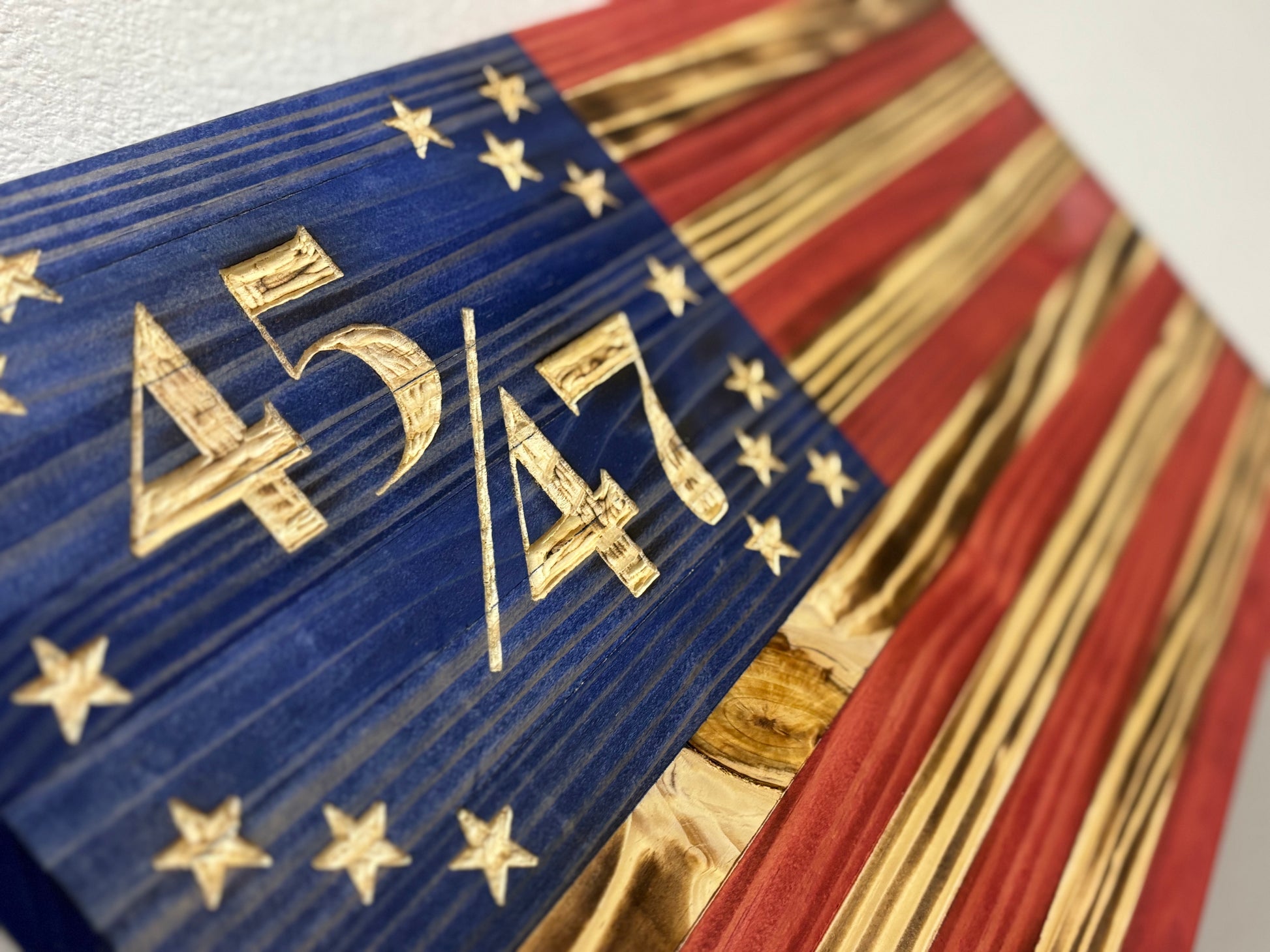 Each 45/47 flag is carefully crafted by hand, ensuring the highest level of detail and quality. The stars, numbers, and stripes are engraved and burned to create a rustic, weathered texture, while the bold colors stand out, making this a true work of art.