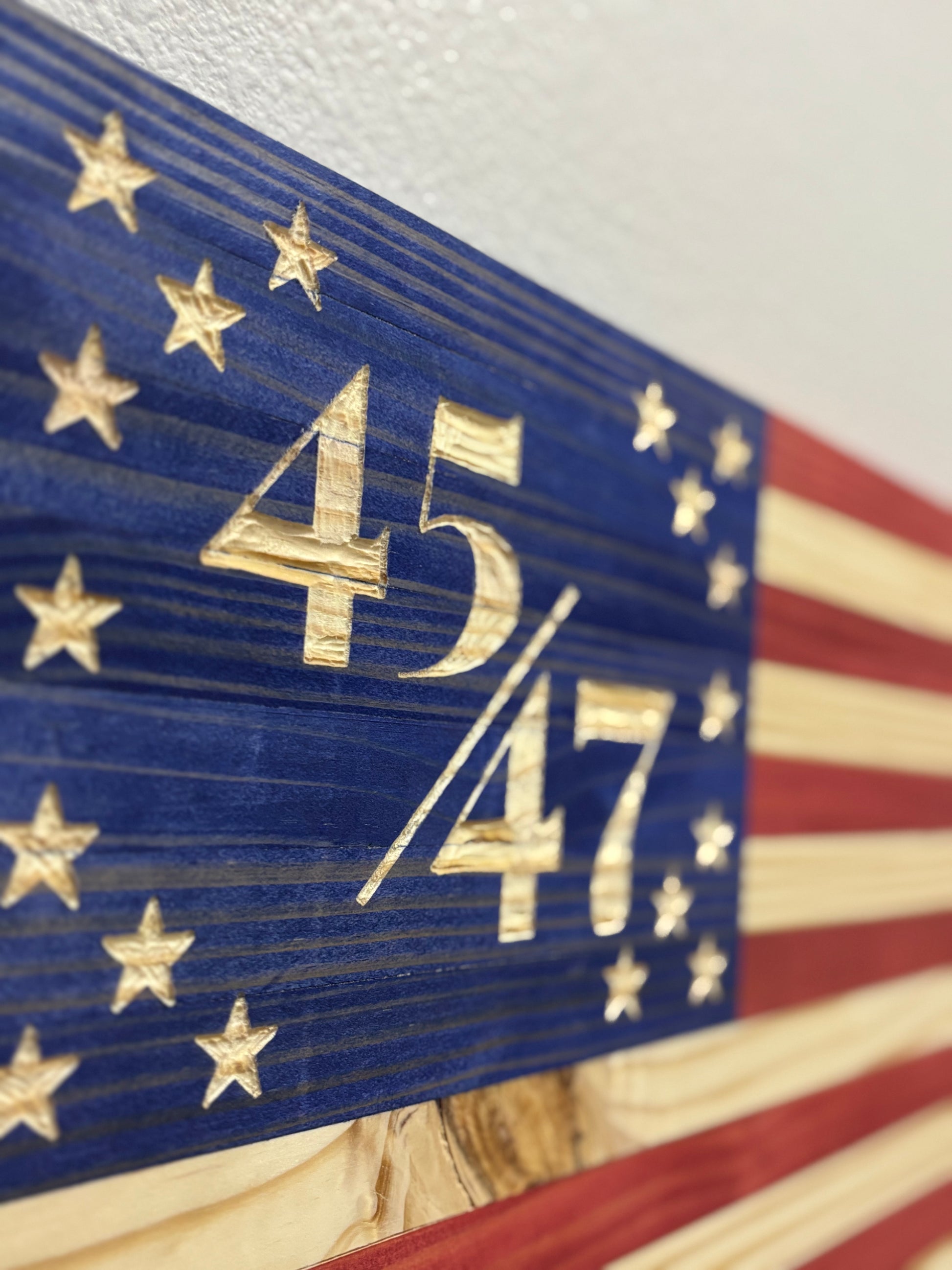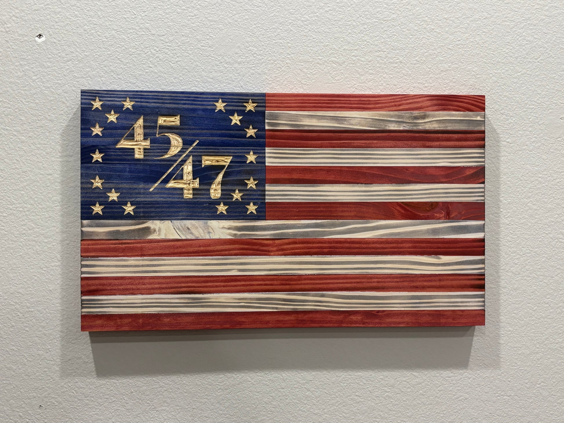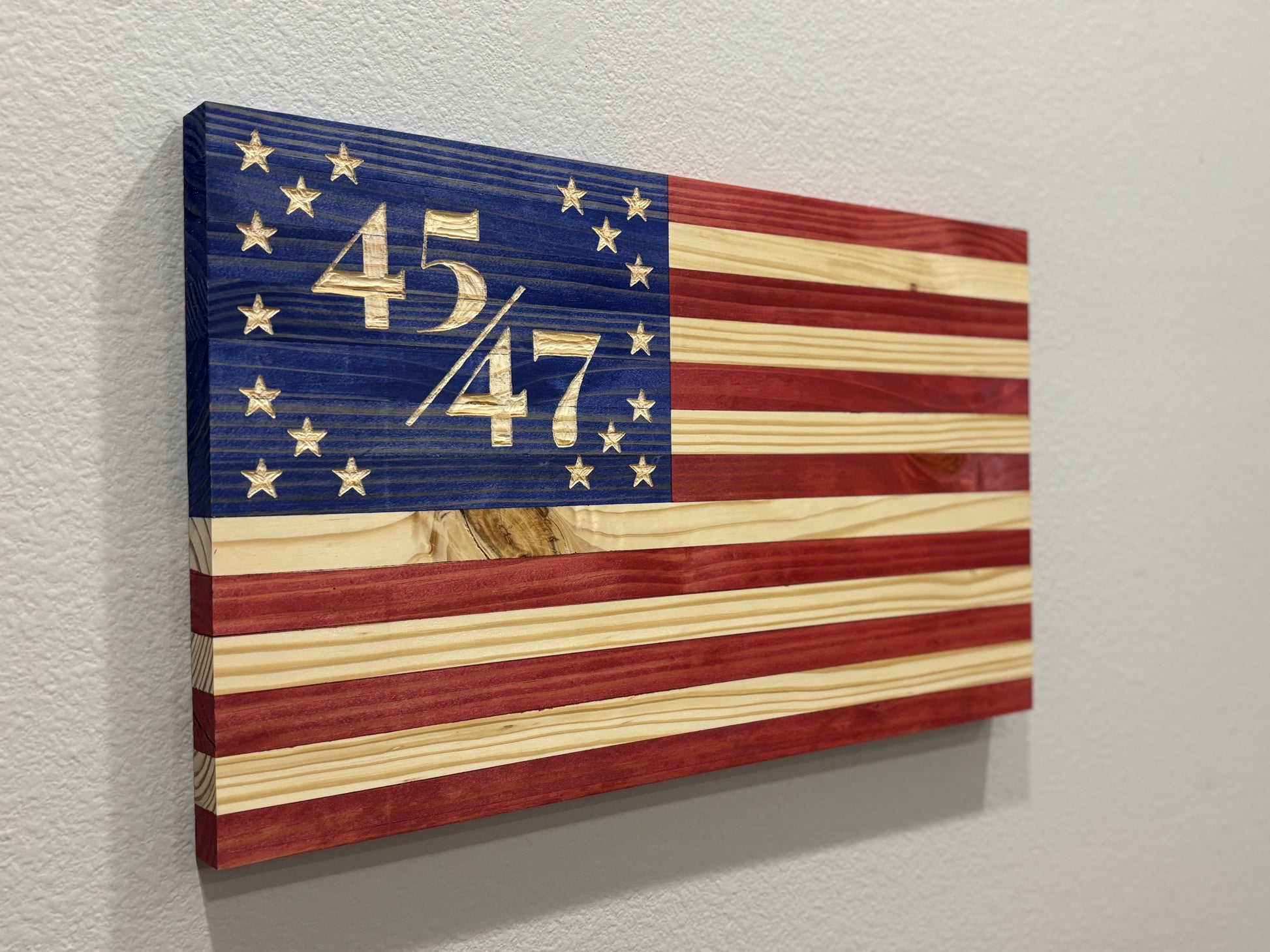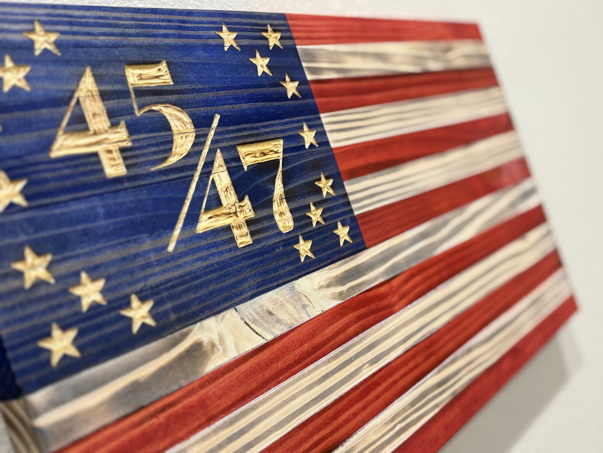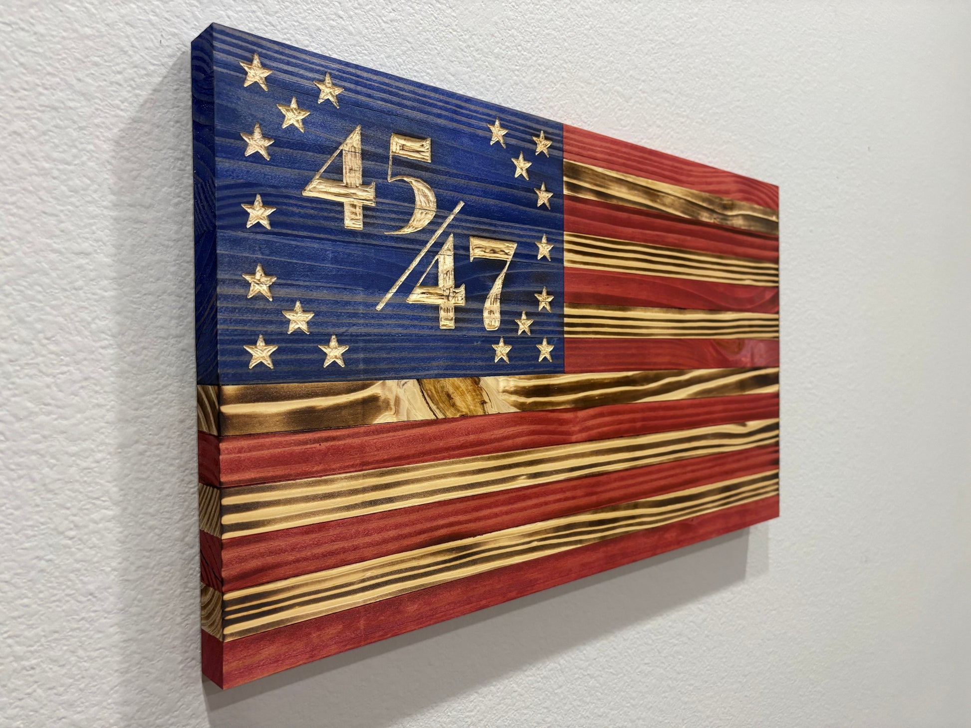 Each 45/47 flag is carefully crafted by hand, ensuring the highest level of detail and quality. The stars, numbers, and stripes are engraved and burned to create a rustic, weathered texture, while the bold colors stand out, making this a true work of art.