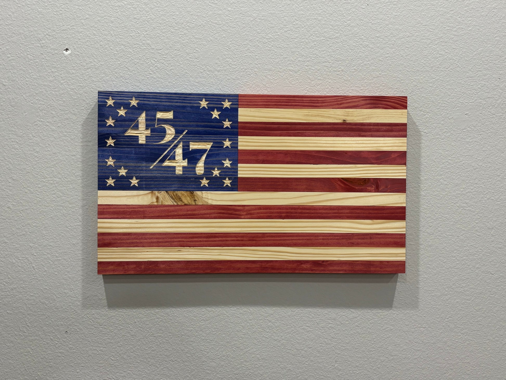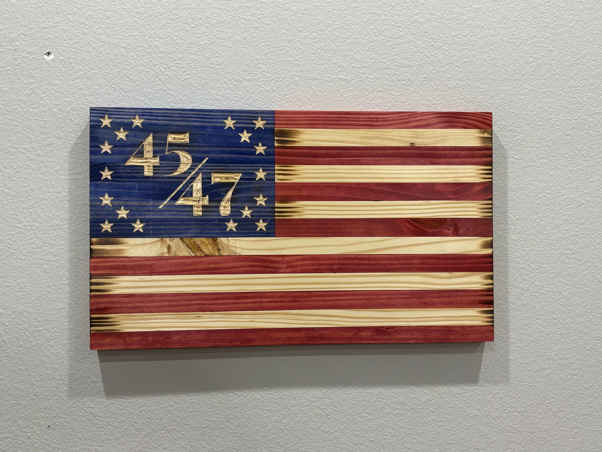 Introducing our 45/47 Trump American Flag, a stunning handcrafted piece that blends historic patriotism with modern American Pride. This flag features the iconic Betsy Ross-inspired design with the numbers “45/47” prominently engraved in the union, symbolizing a bold tribute to Donald J. Trump as the 45th and 47th President of the United States. The wood-burnt effect and vibrant red, white, and blue finishes create a rustic yet eye-catching addition to any space.