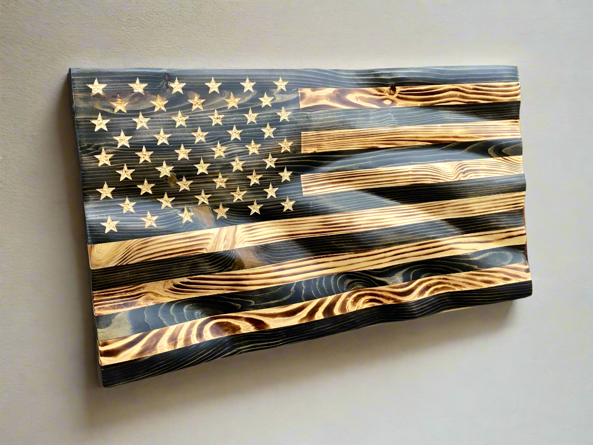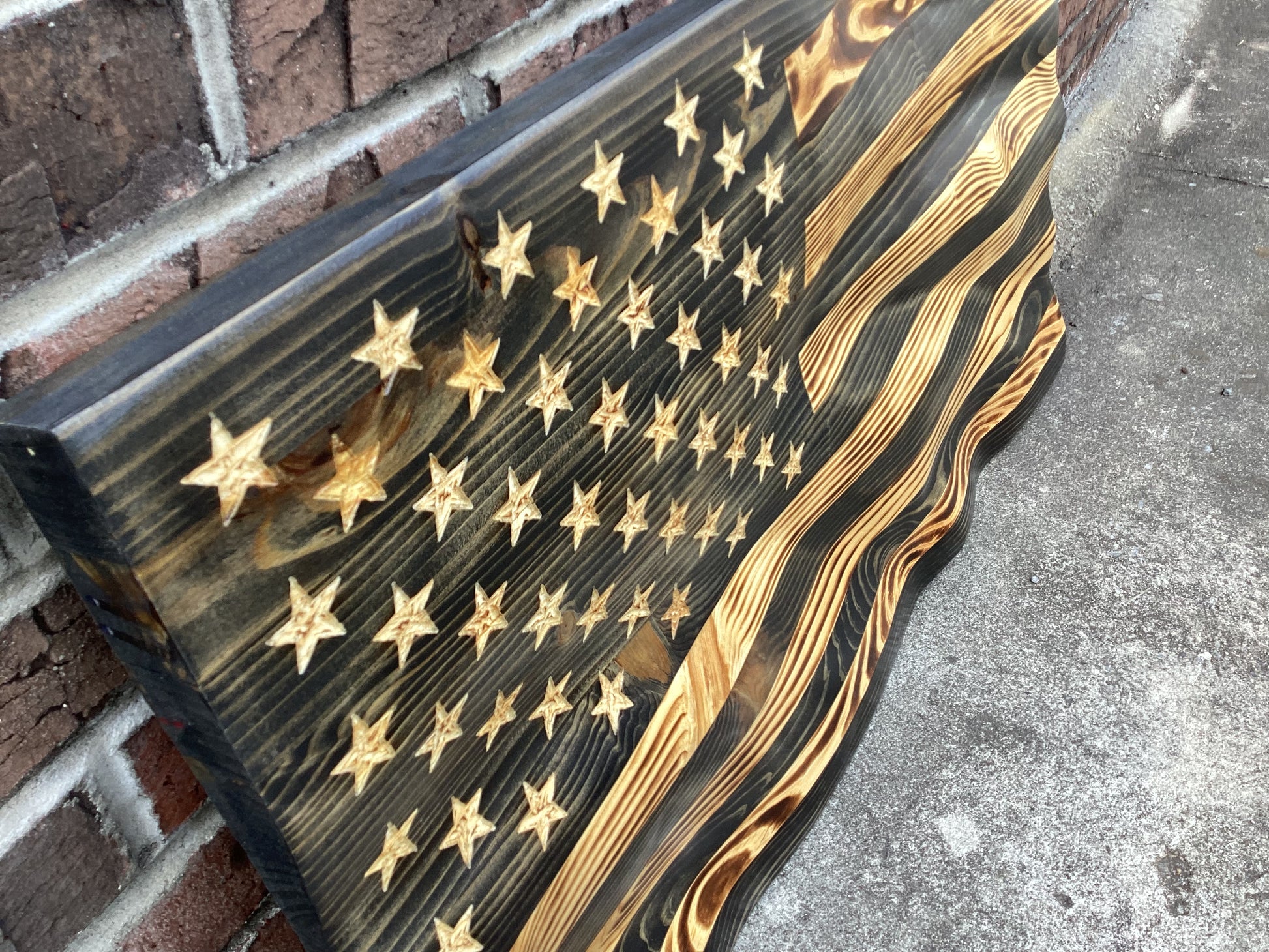 Handcrafted Waving Wooden Extra Rustic Wood Burnt Blacked Out American Flag – Bold Patriotic Wall Art