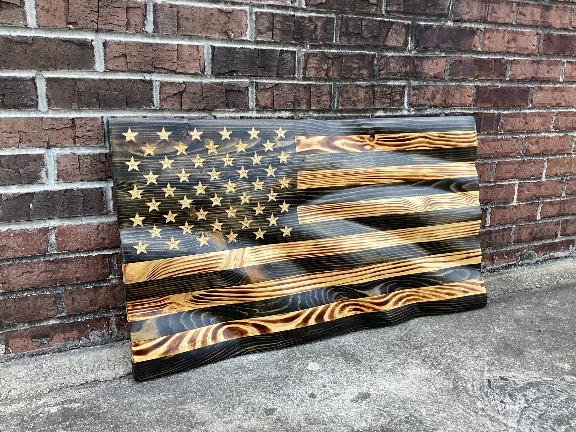 Waving Wooden Extra Rustic Wood Burnt Blacked Out American Flag