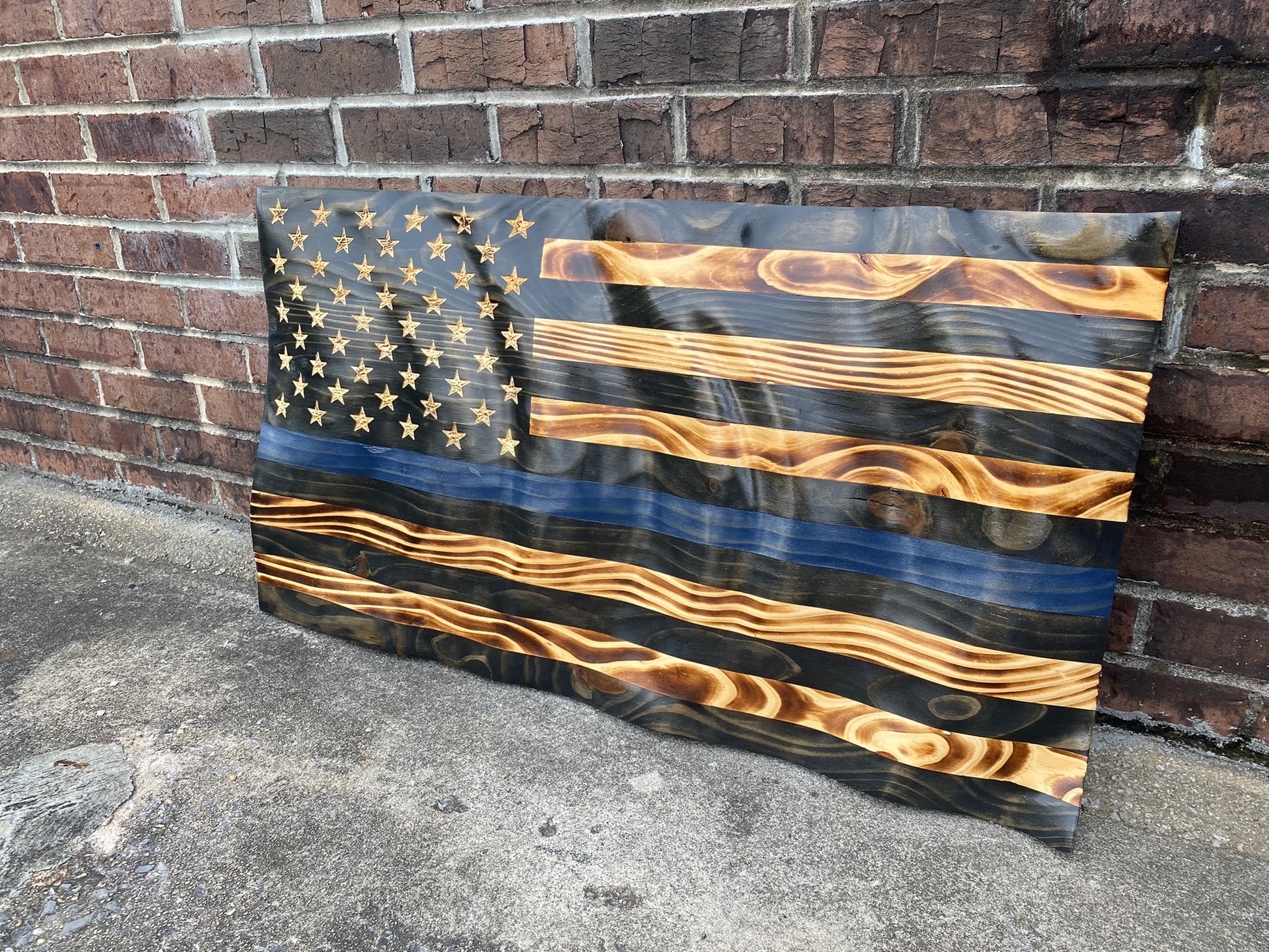 Handcrafted Waving Wooden Extra Rustic Wood Burnt Thin Blue Line Police Flag – Patriotic Wall Art