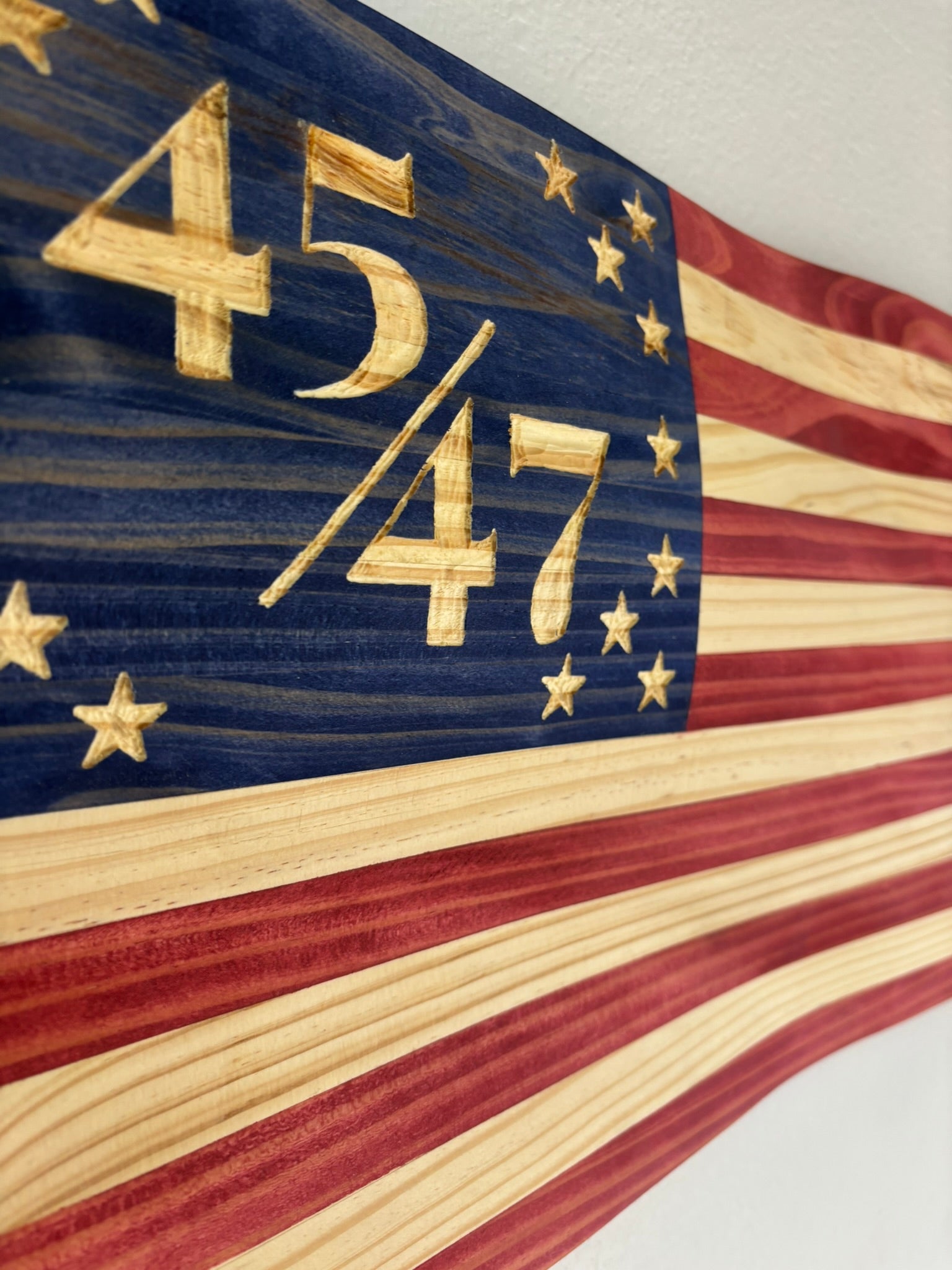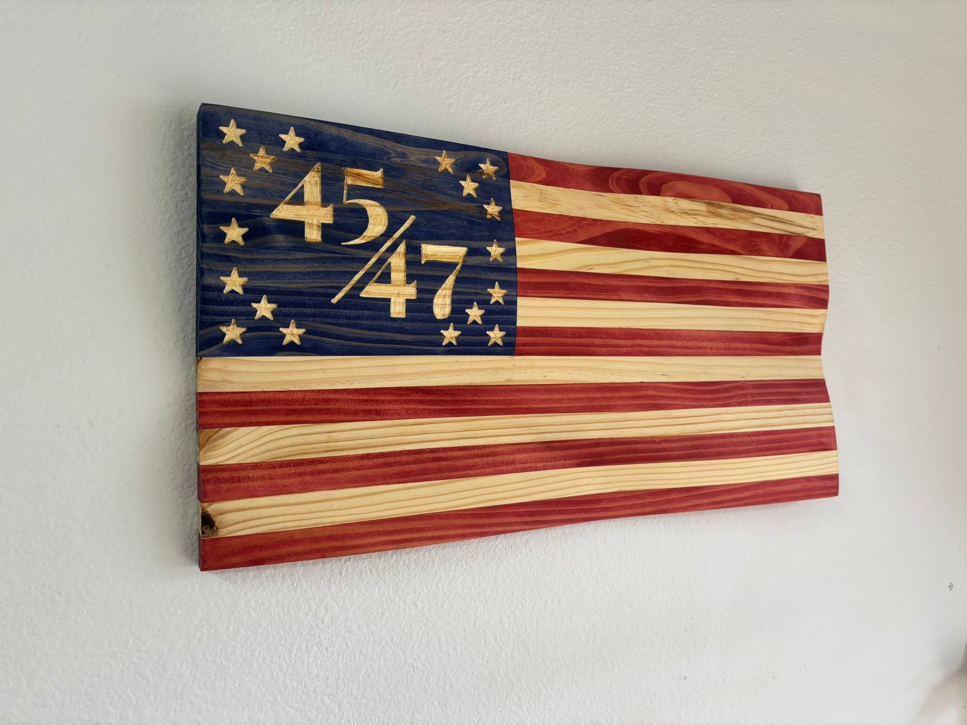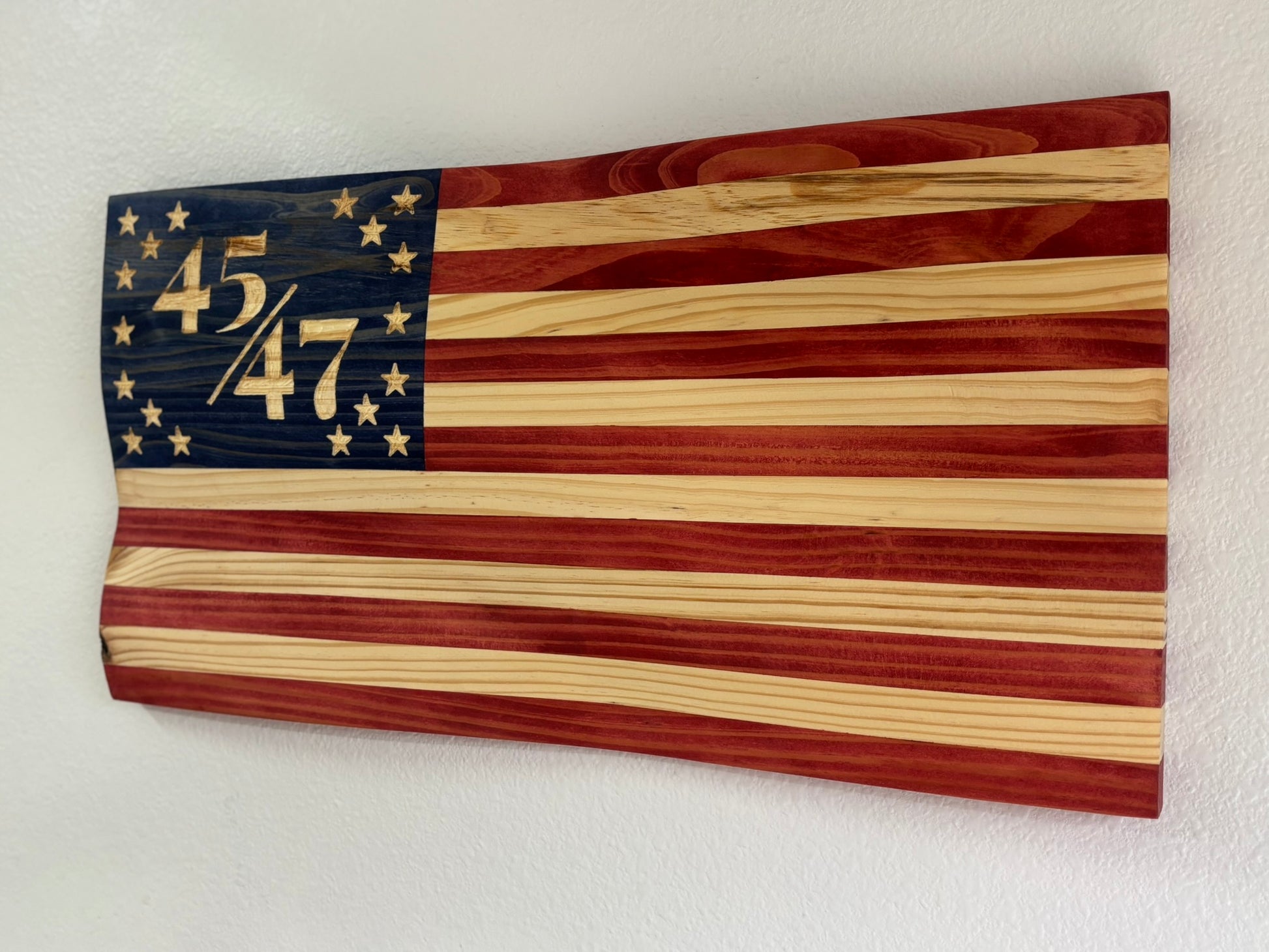 Celebrate craftsmanship and patriotism with our Handcrafted Waving Wooden 45/47 Flag. This beautifully designed flag features a unique waving effect, giving it a dynamic and eye-catching look. The design is inspired by classic American heritage, incorporating a timeless Betsy Ross-style union with "45/47" prominently displayed in the center.