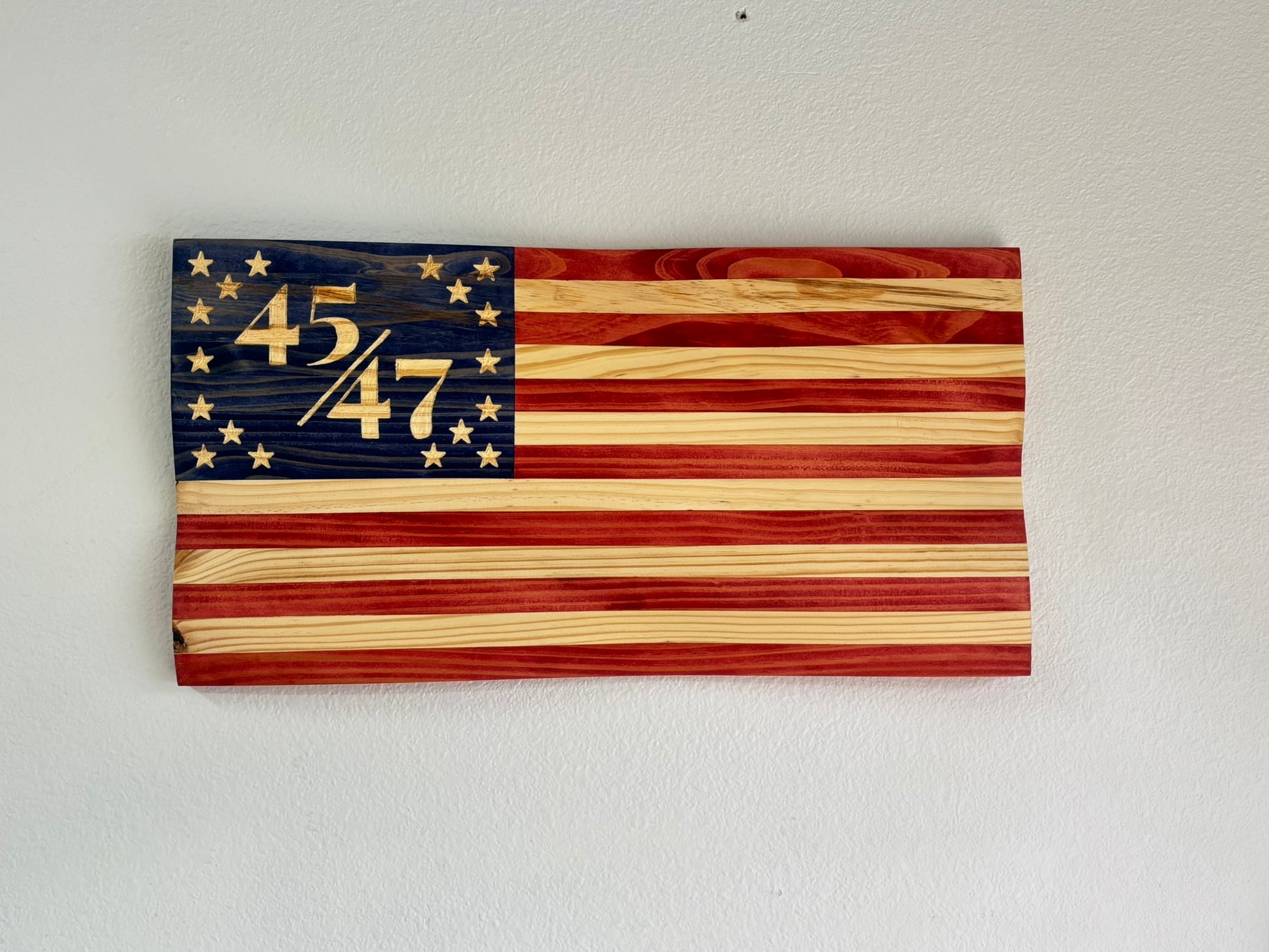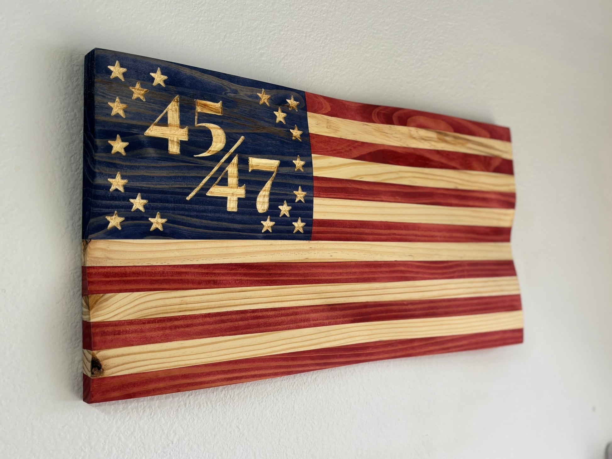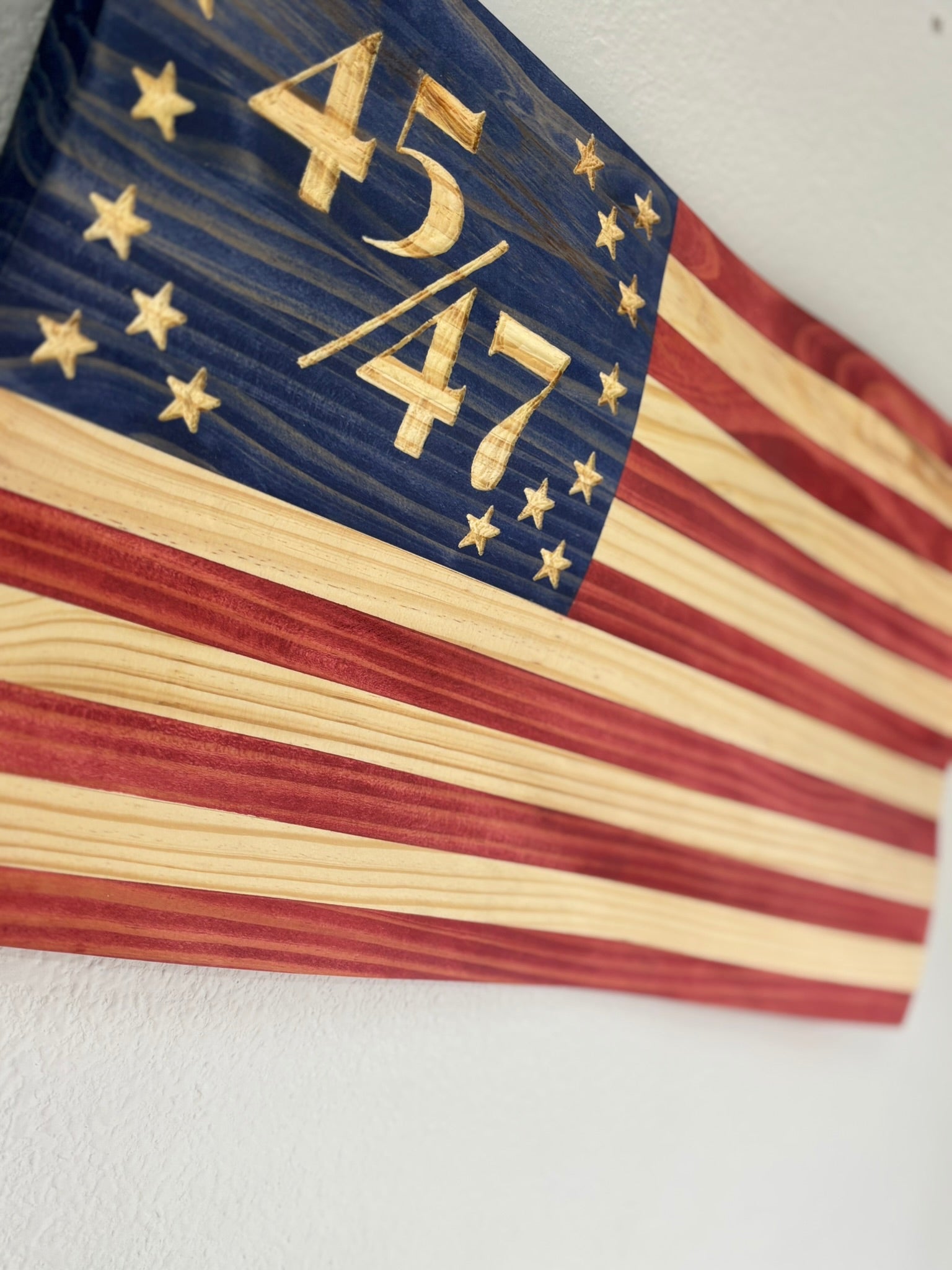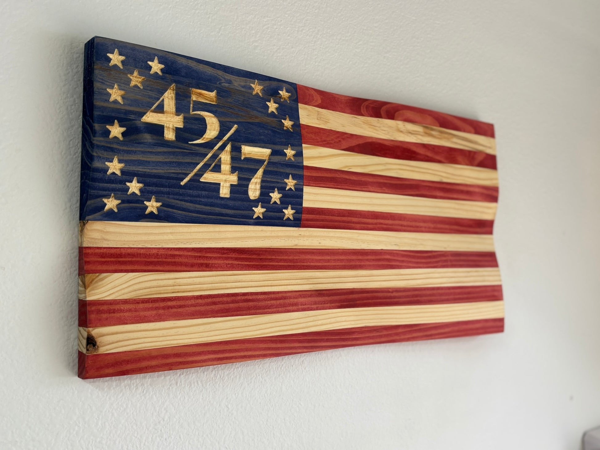Celebrate craftsmanship and patriotism with our Handcrafted Waving Wooden 45/47 Flag. This beautifully designed flag features a unique waving effect, giving it a dynamic and eye-catching look. The design is inspired by classic American heritage, incorporating a timeless Betsy Ross-style union with "45/47" prominently displayed in the center.