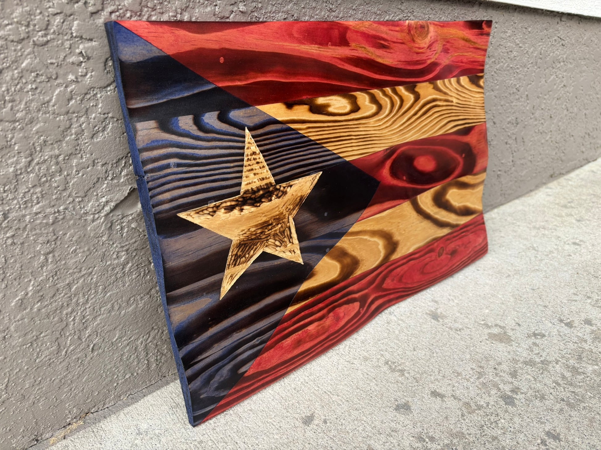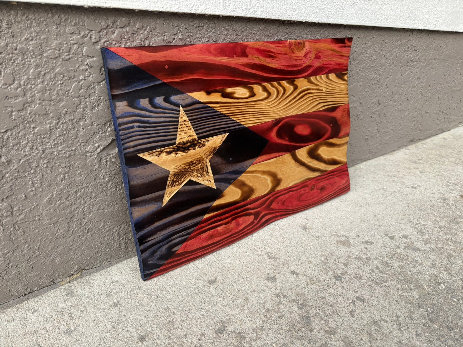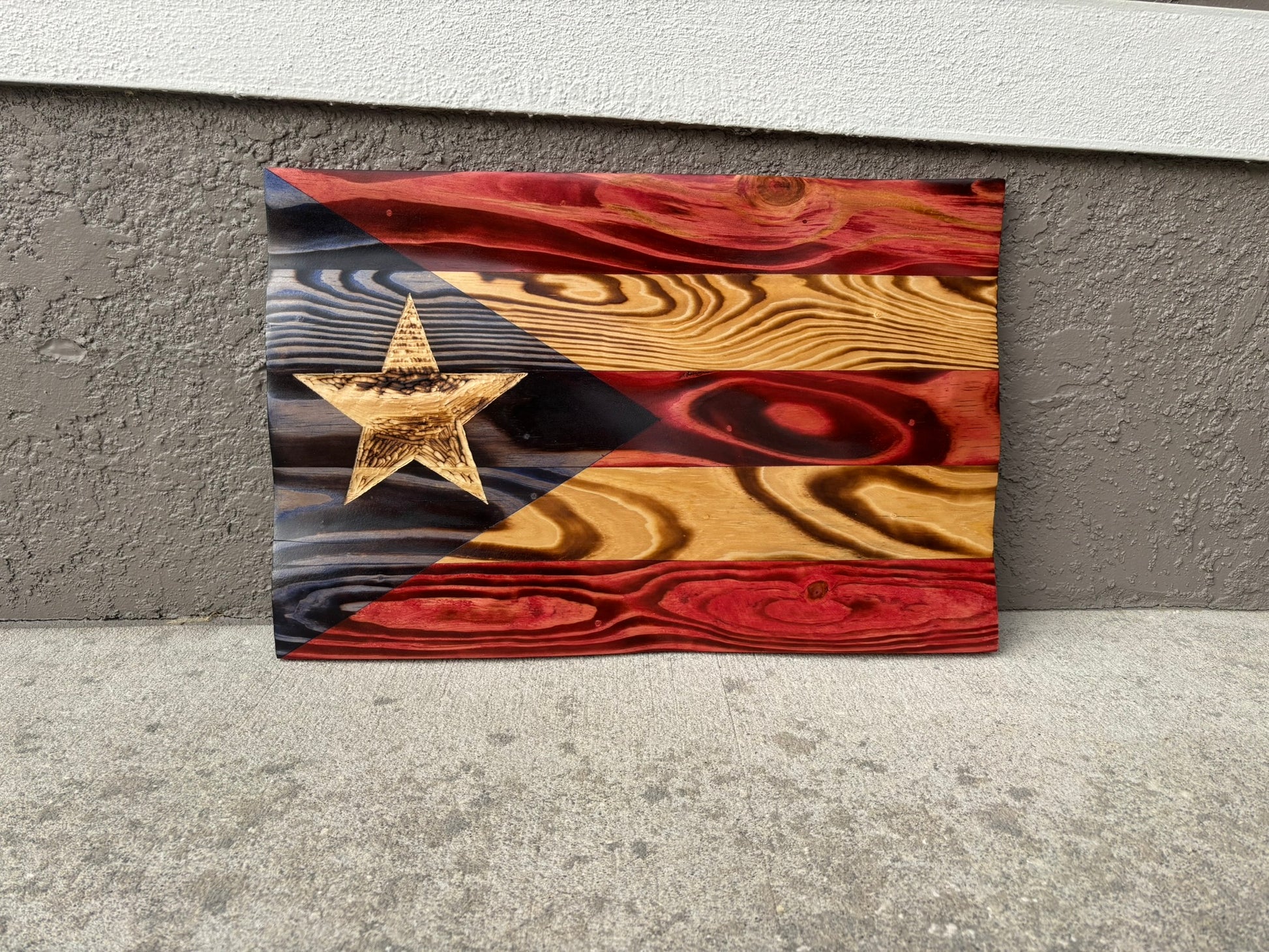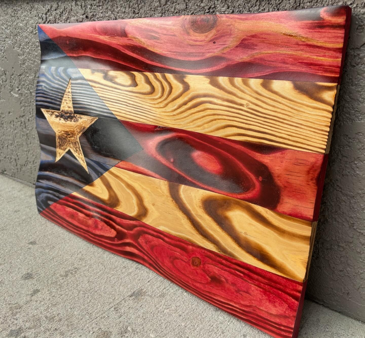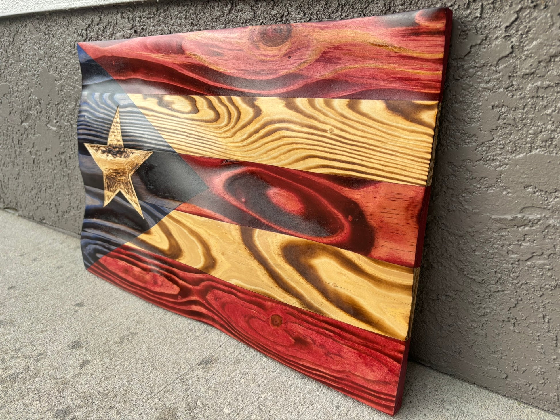 Celebrate Puerto Rican heritage with this beautifully handcrafted Waving Wooden Puerto Rican Flag. Designed with a unique waving effect, this piece showcases the vibrant red, white, and blue colors of Puerto Rico's iconic flag, accented with a rustic wood-burnt finish. The natural wood grain shines through the design, adding warmth and character to every detail, from the triangular blue field to the hand-carved star.