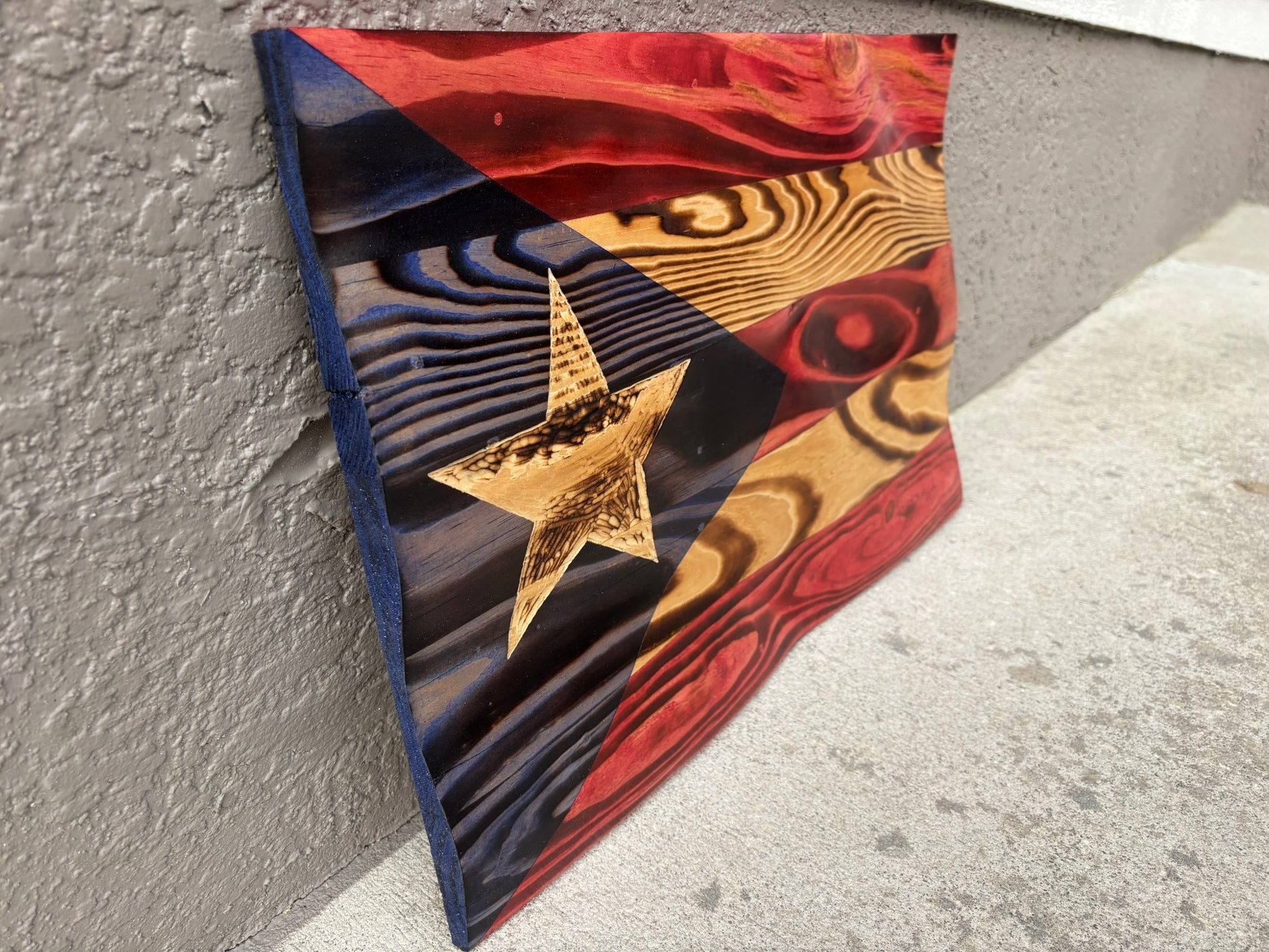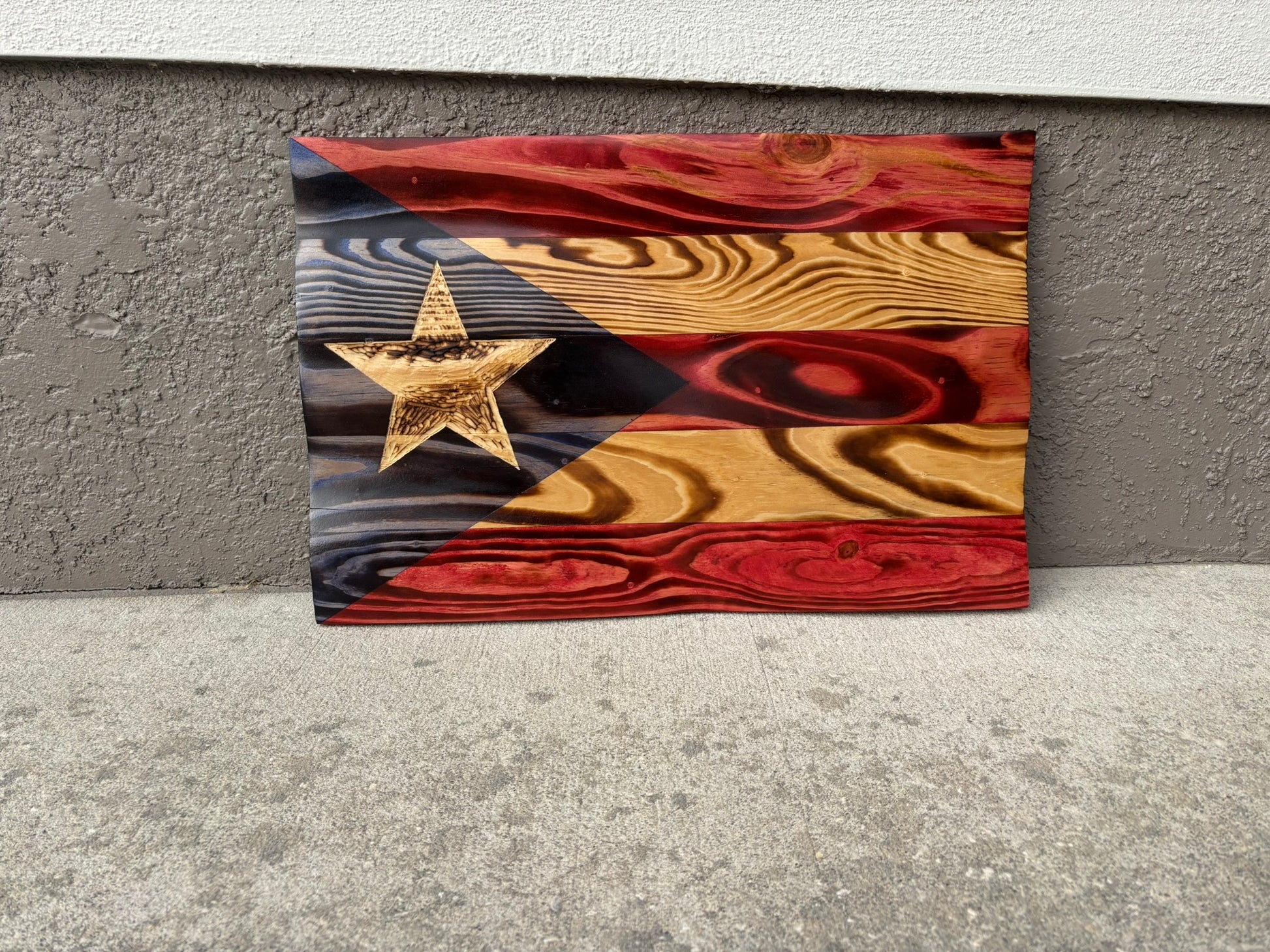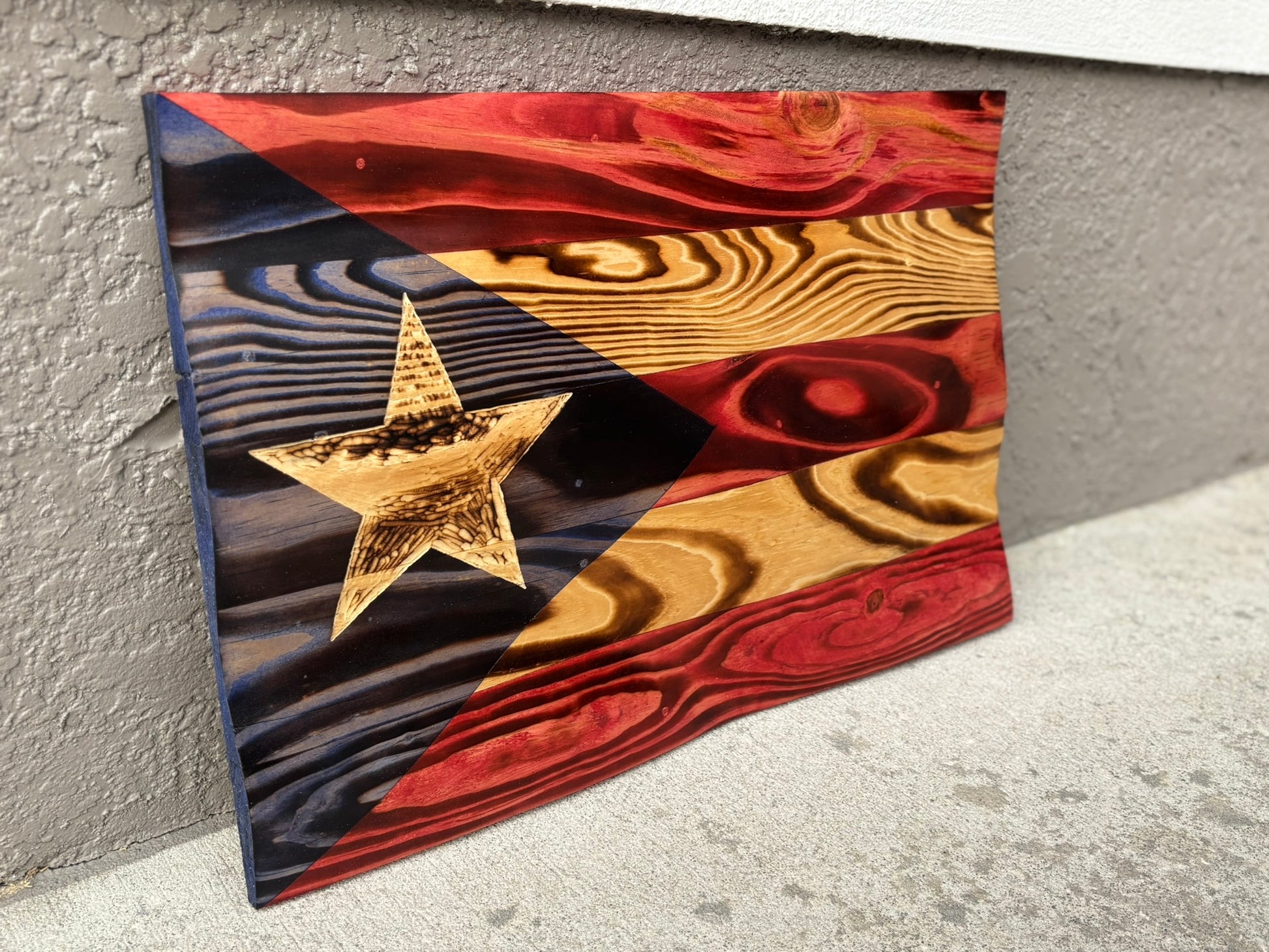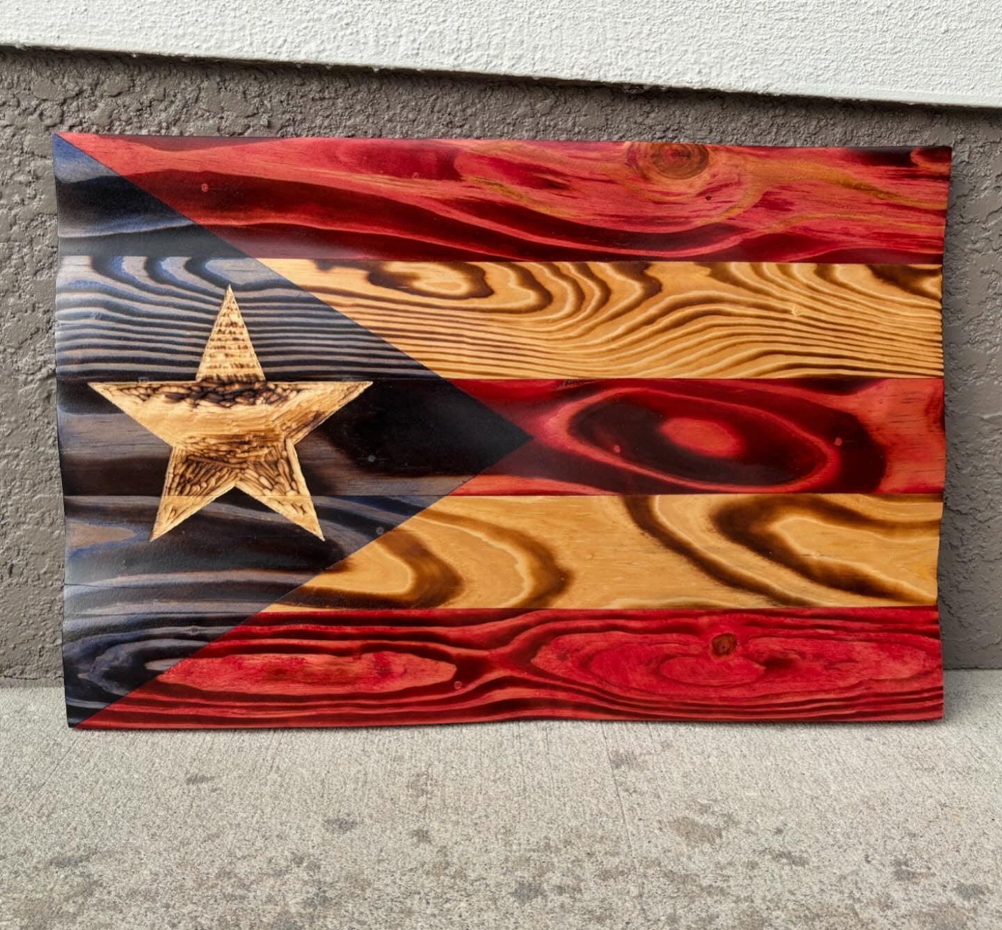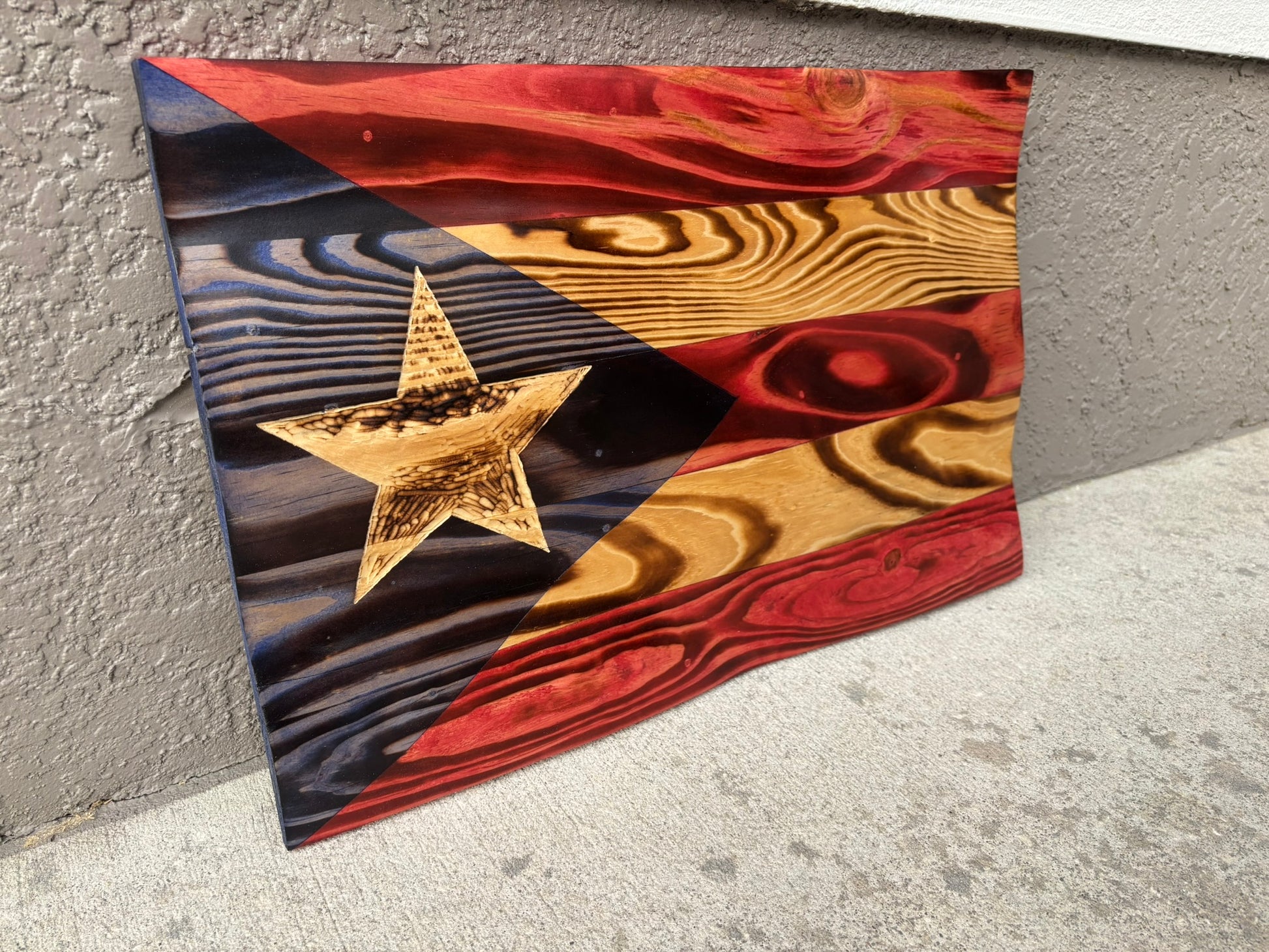 Celebrate Puerto Rican heritage with this beautifully handcrafted Waving Wooden Puerto Rican Flag. Designed with a unique waving effect, this piece showcases the vibrant red, white, and blue colors of Puerto Rico's iconic flag, accented with a rustic wood-burnt finish. The natural wood grain shines through the design, adding warmth and character to every detail, from the triangular blue field to the hand-carved star.