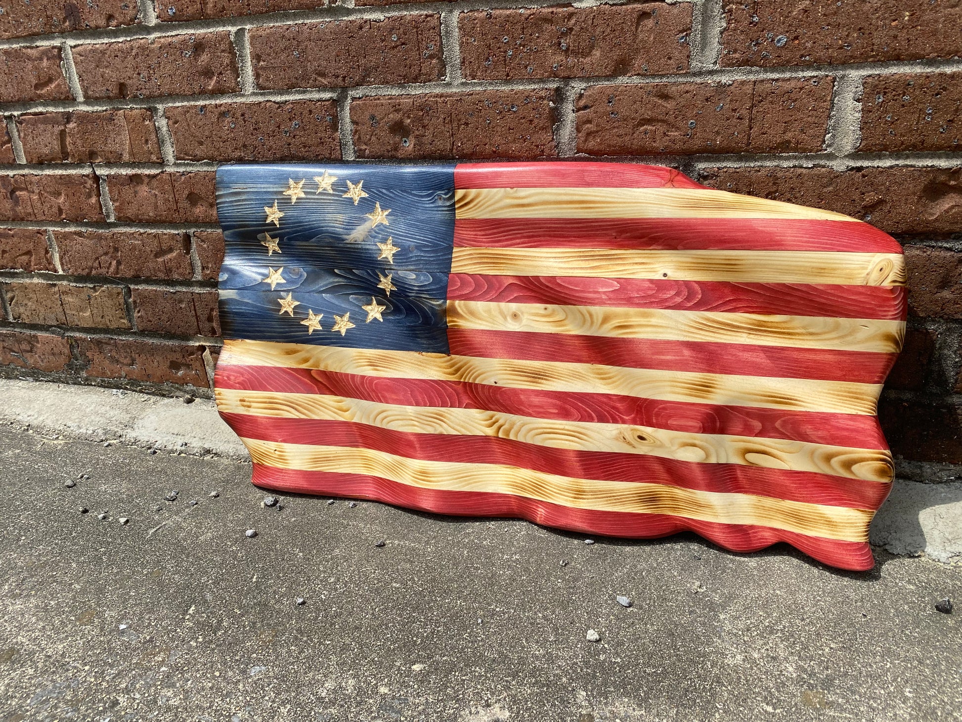 Handcrafted Waving Wooden Betsy Ross Flag – Realistic, Patriotic Wall Art