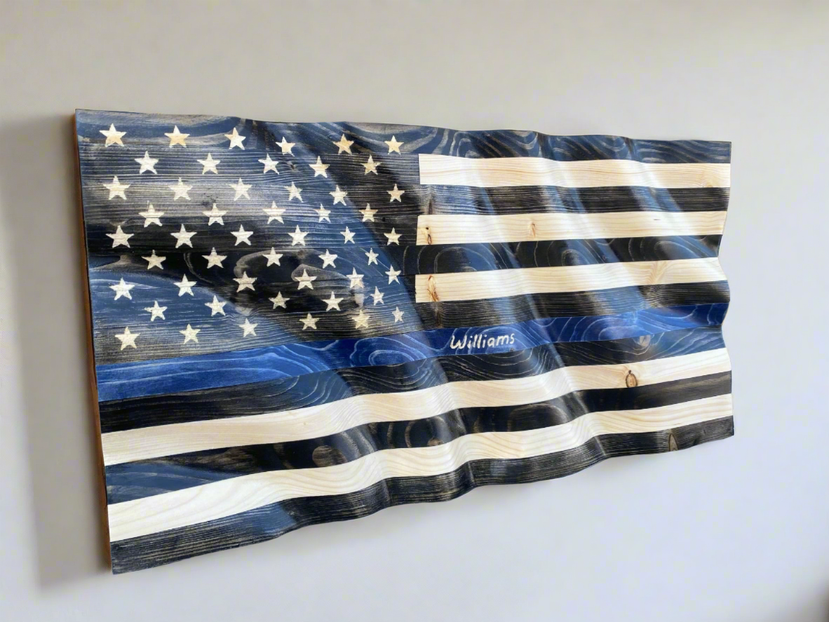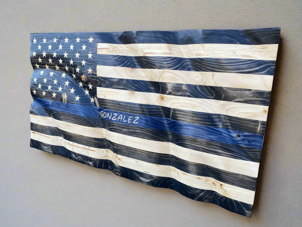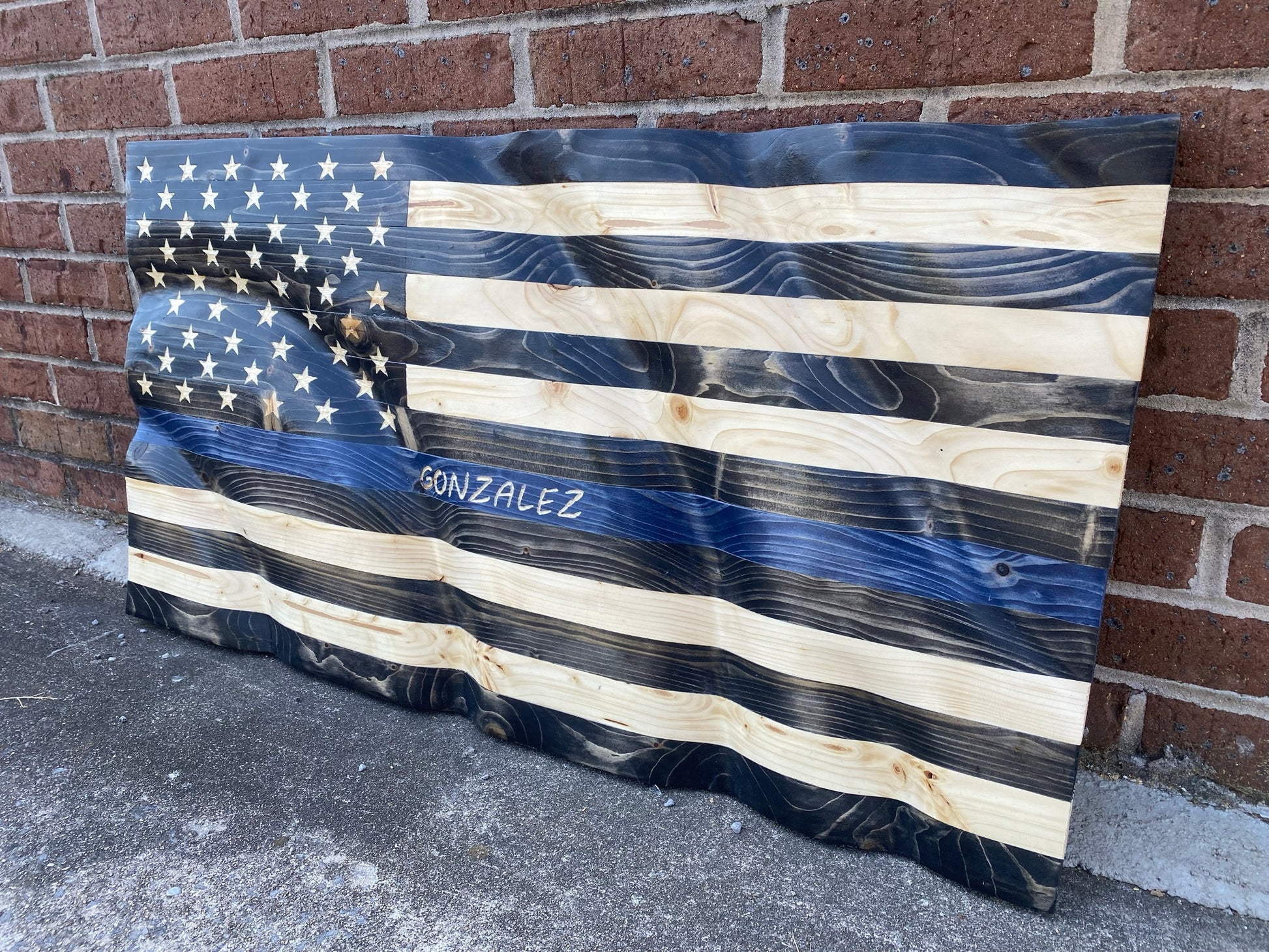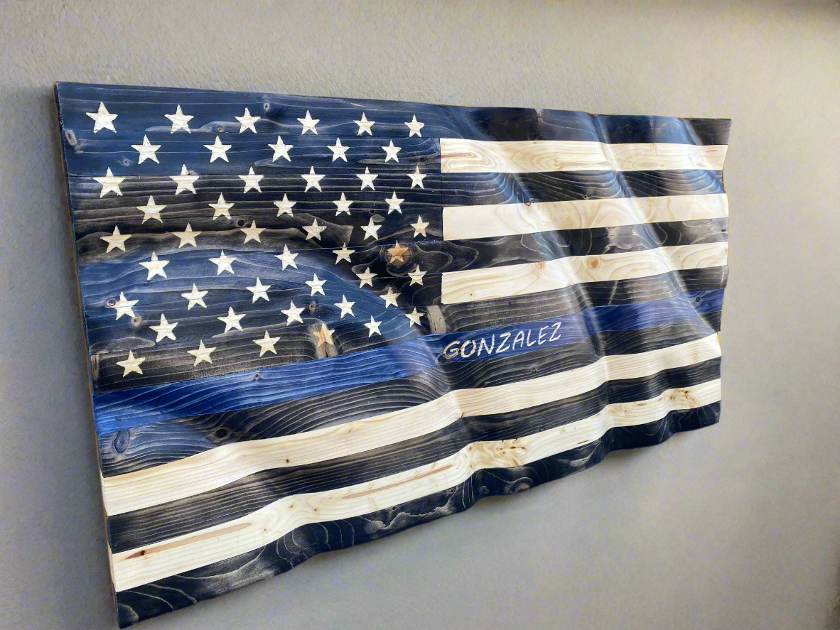 Handcrafted Waving Wooden Thin Blue Line Police Flag – Patriotic Wall Art