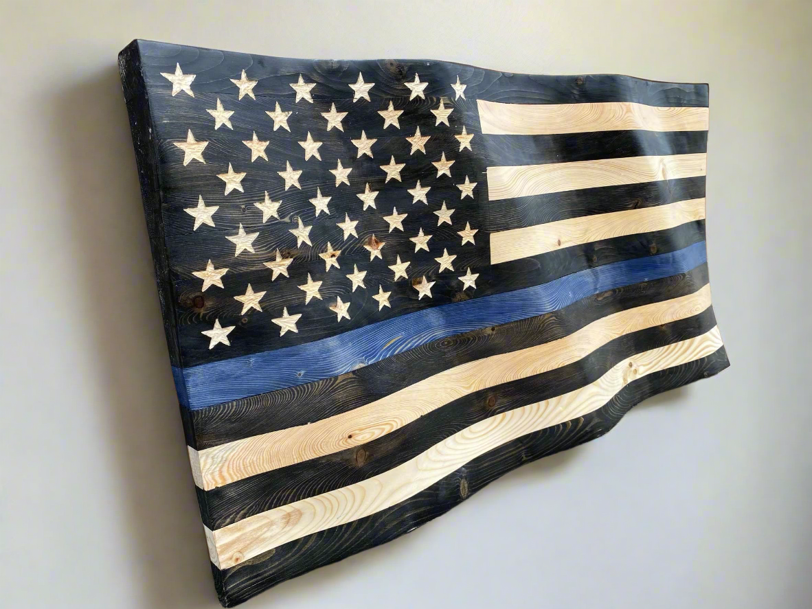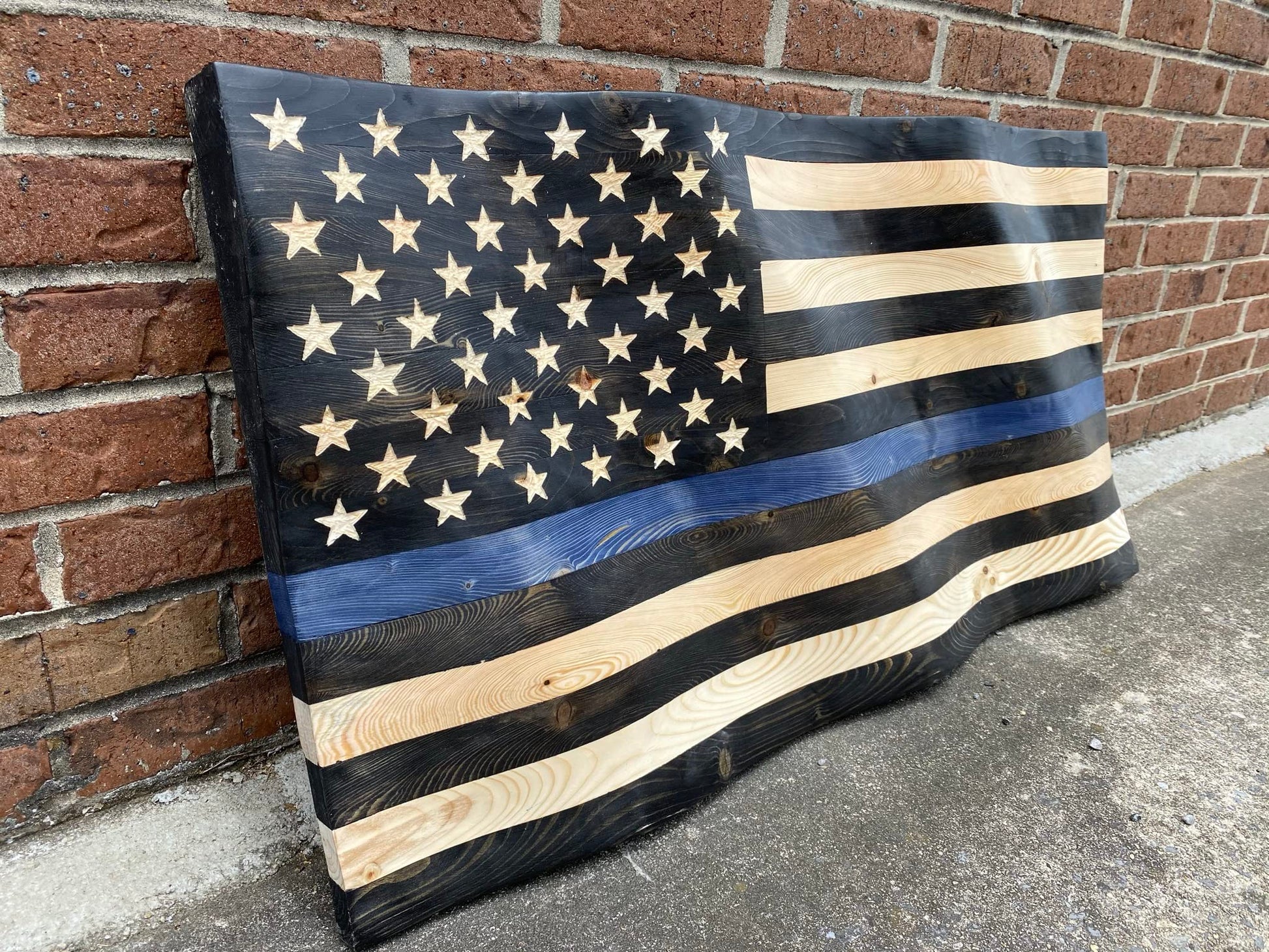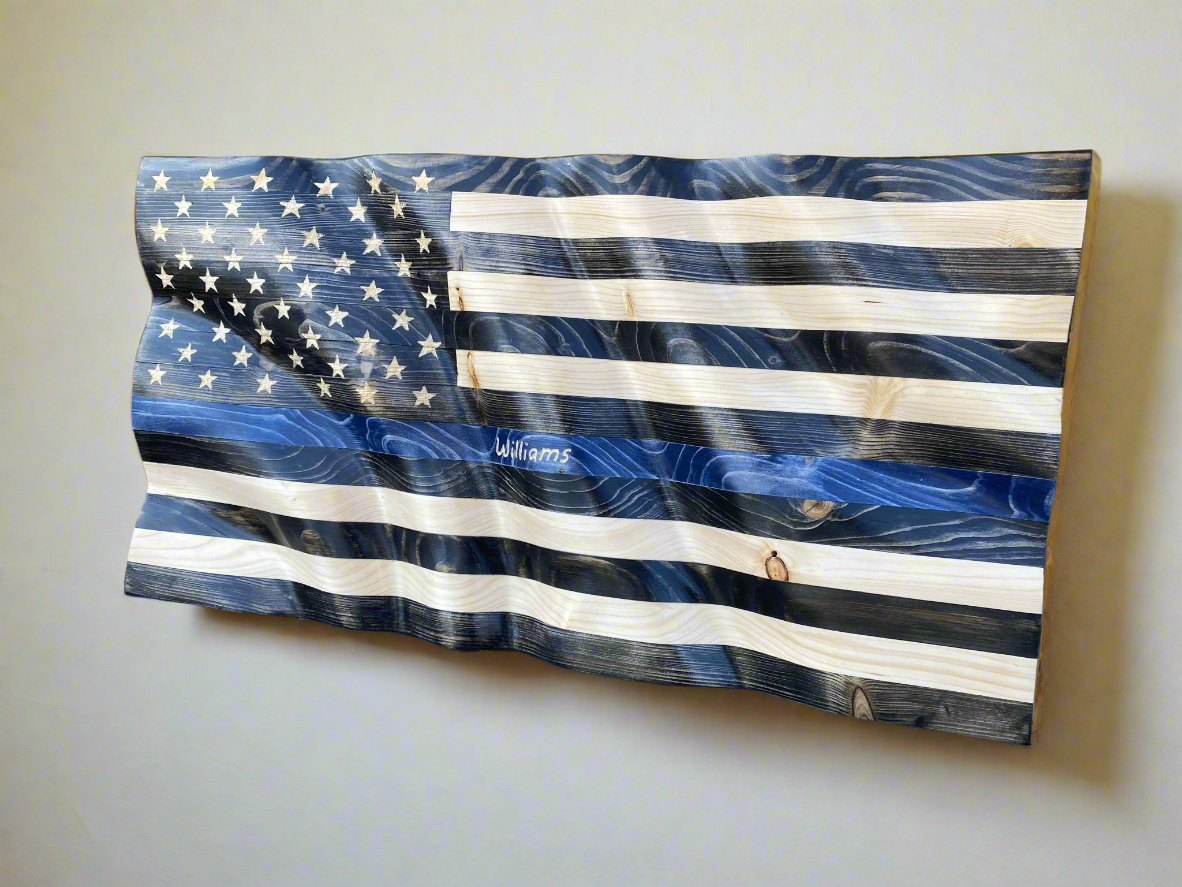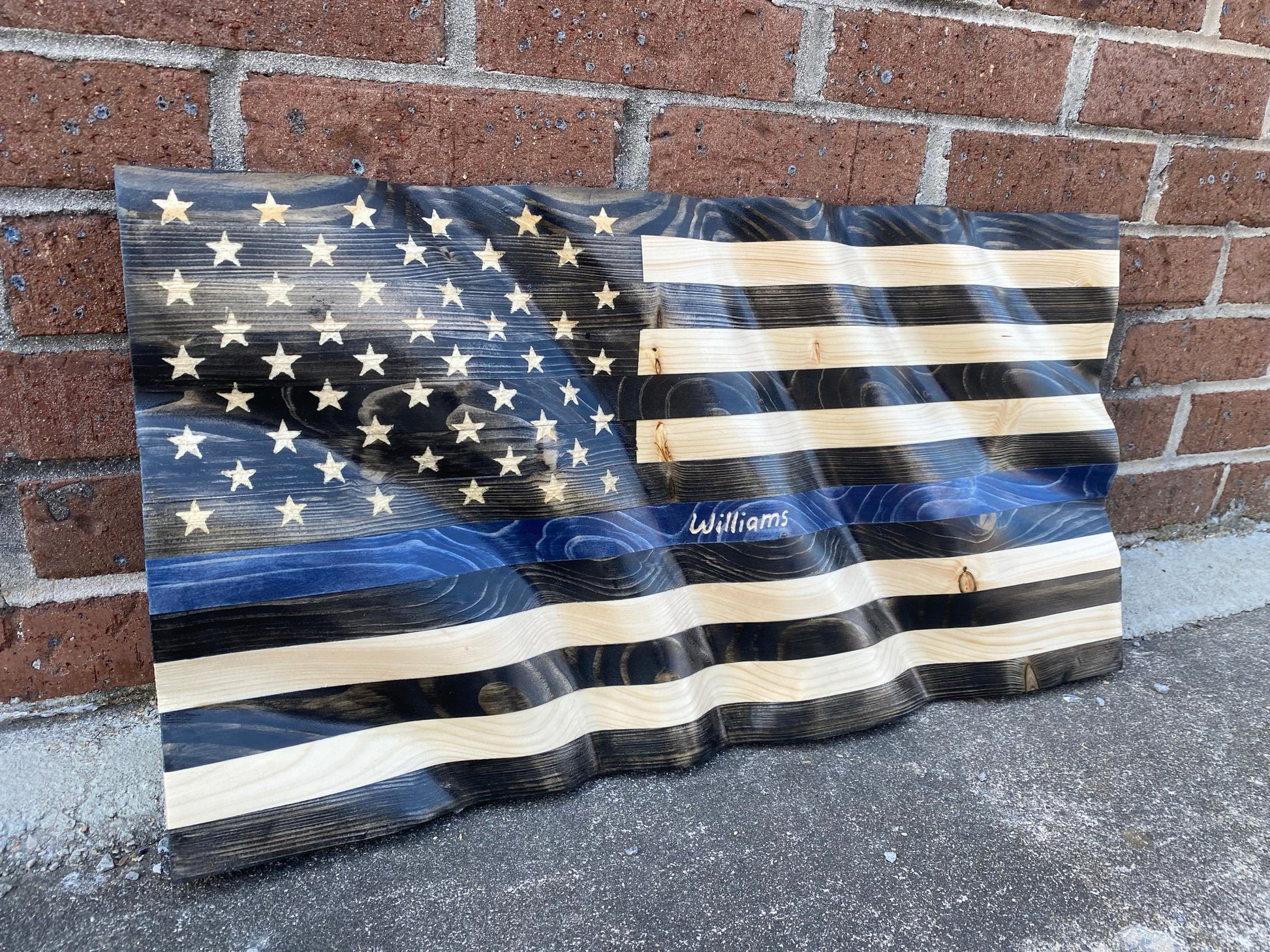Handcrafted Waving Wooden Thin Blue Line Police Flag – Patriotic Wall Art